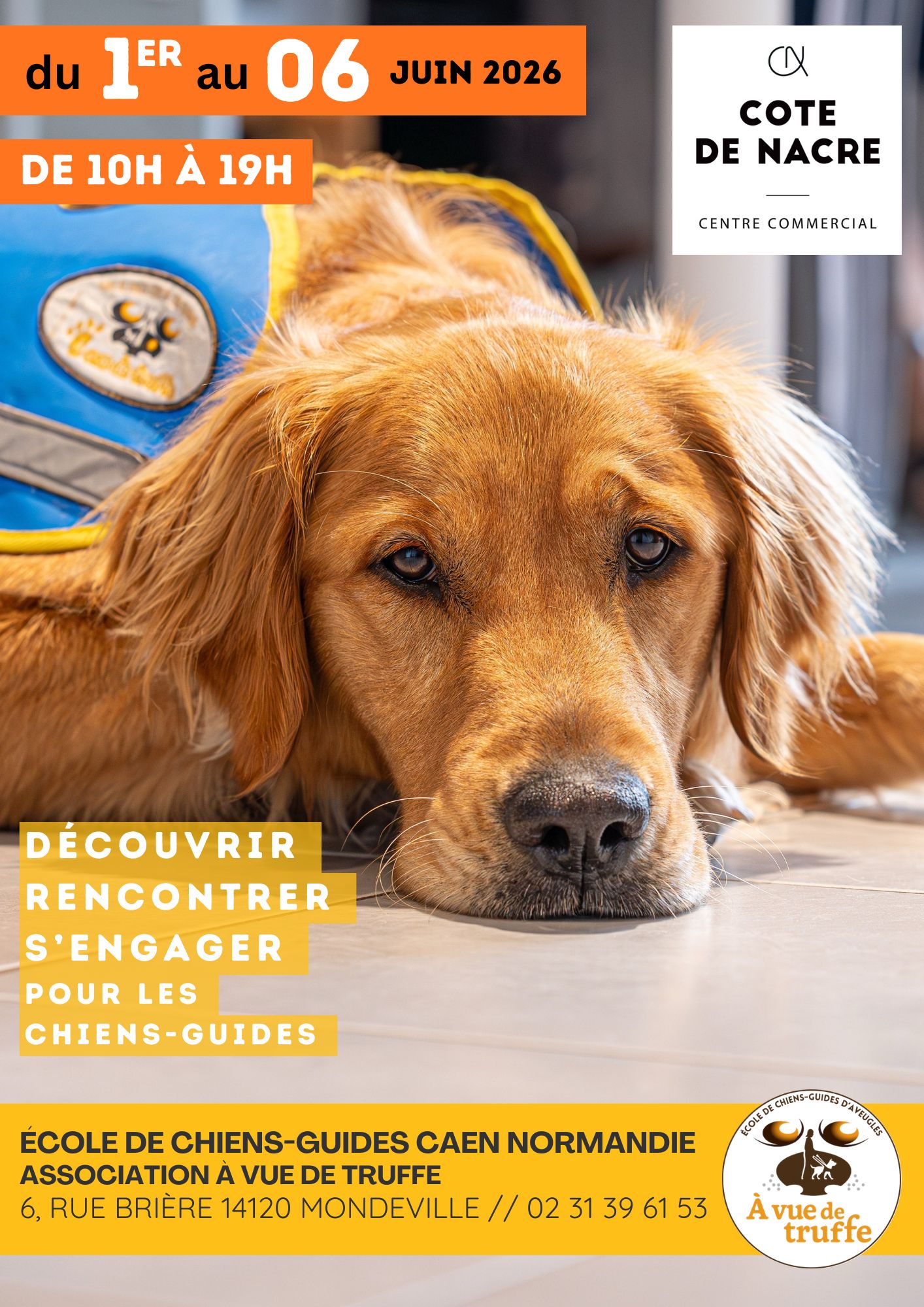 Du lundi 01 au samedi 06 juin 2026, l’association tiendra un stand de sensibilisation et d’information autour du chien-guide, au sein de la galerie du centre commercial Cote de Nacre