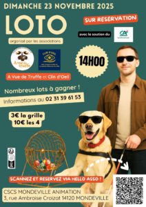 Les associations A Vue de Truffe et Association Clin d'œil Normandie Mondeville organisent un loto solidaire pour soutenir les actions dédiées à l'autonomie et le lien social des personnes déficientes visuelles. Ce loto se tiendra dimanche 23 novembre 2025 à 14h, dans la salle Diane Tell du Carrefour Socio-Culturel et Sportif Mondeville Animation. Vous pouvez d'ores et déjà vous inscrire en ligne via la plateforme HelloAsso, en cliquant sur le lien suivant : https://www.helloasso.com/.../lot-a-vue-de-truffe-et.../1 Vous pouvez également scanner le QR…