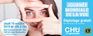Nous aurons le plaisir de vous retrouver jeudi 10 octobre au CHU de Caen, pour la Journée de la Vue 2019, organisée par le Lion's Club Caen Viking. N'hésitez pas à vous rendre à cet événement et rencontrer les différents organismes présents. Merci au Lion's Club Caen Viking pour leur invitation !