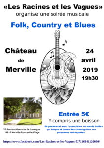 Une soirée musicale sera organisée par l’association « Les Racines et les Vagues » au profit de notre école de chiens-guides ! Cet événement se déroulera mercredi 24 avril 2019 à partir de 19h30, au château de Merville-Franceville, dans une ambiance folk, country et blues. L’entrée est au prix de 5 euros (une boisson comprise). Pour visiter la page Facebook de l’association « Les Racines et les Vagues », vous pouvez cliquer sur le lien suivant : https://www.facebook.com/Les-Racines-et-les-Vagues-527116841126030/ Nous tenons à remercier Mme Jane Denizot, co-organisatrice…